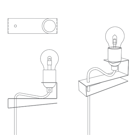 折り曲げられている真鍮製のクランプが、電球と鮮やかな青色のコードを支え、そして壁に取り付けられる。
