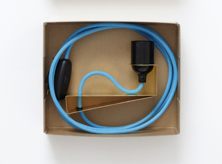 真鍮クランプはスエーデンの最北端、シェレフテア(Skellefteå)で生産されました。熱硬化性樹脂、ベークライトの電球は、巨大なヴェーネルン湖沿いにあるグレストープ(Grästorp)村で生産されました。鮮やかな青色のコードは、スーデンの西側にある深い森のなかにある工場から、包装用の箱はストックホルム郊外の工場で手作業で作られています。