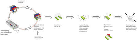 コペンハーゲンで開催された気候変動に関する国際連合枠組み条約を話し合う会議(United Nations Framework Convention on Climate Change=UNFCCC)に合わせて、デンマーク人建築家集団のMAPTが、使われなくなった貨物用コンテナの再利用品のパビリオンをコペンハーゲンで発表した。