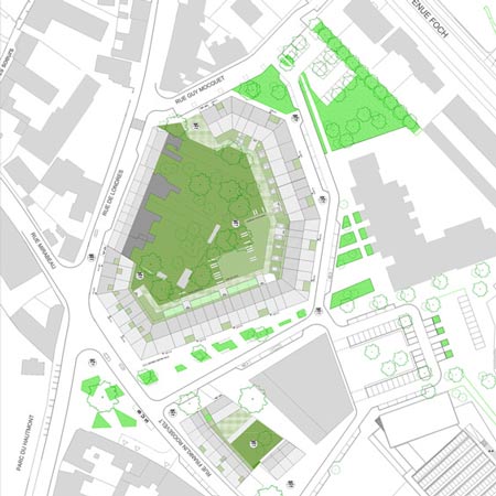 我々はこのような視点に立ち、さらに住宅、車、人が集う公共スペースの位置づけや再構築、そして都市環境などの要素も考慮に入れながらこのプロジェクトを進めていきます。それらが全てプロジェクトの中に組み込まれることで、新しい持続可能な都市モデルが完成します。我々がMouvauxの都市環境を構成する建築の用途や構造を分析することでたどり着いた結論は、社交性とプライバシーが同時に維持できる中間的な住宅環境の概念に基づくハイブリッド型住宅という発想でした。