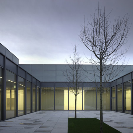新しい建物は、再生グラスブロックに包まれ、4つの中庭の周辺に計画された6つの構造物から成り立つ。