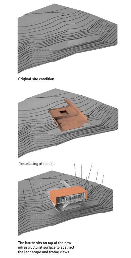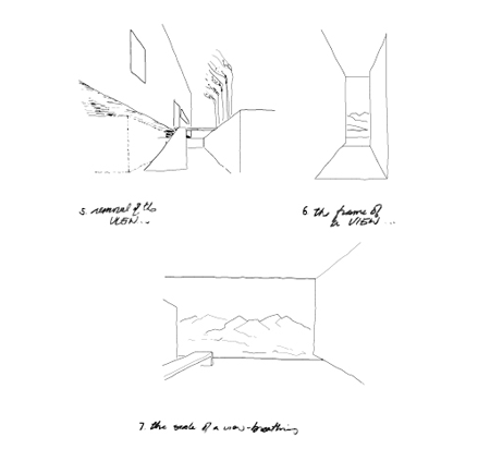建物自体は、山々を望む優れた視界と、この住宅に内在する公私を明確にした空間的構造の両者を追求する「枠」としての機能を果たします。これは主として建物の正面と裏側の外壁処理により実現されます。