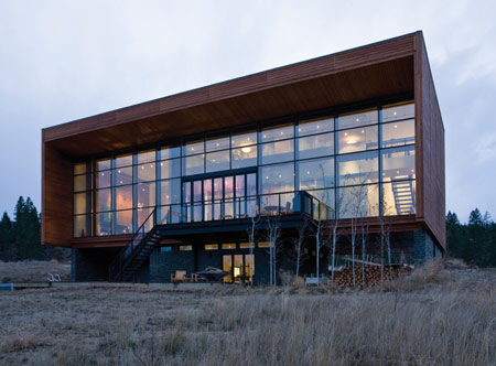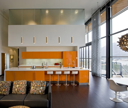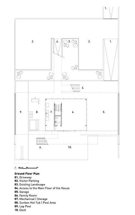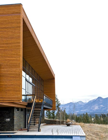 この住宅の正面には、18フィートの可動式ガラスドアが取り付けられ、外のテラス、プール、温泉施設、さらに山々の景色を見渡せます。この建築の意図は、各階が循環する構造にあり、その過程で心に残る風景の断片が、山々や美しい景色を微妙に変える「額縁」としての機能を果たすのです。