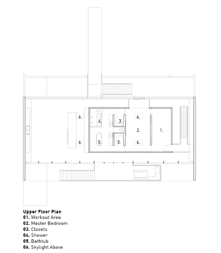 この「箱」の中心となる二階には、子供用の寝室が三か所と、他に生活に必要な洗面所、洗濯室、倉庫などのスペースがあります。主寝室とそれに隣接する浴室は、中二階にあります。住宅自体の外観的構造は、二階建ての公共性が強い建築で、その中に人が集う娯楽施設があります。