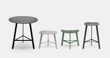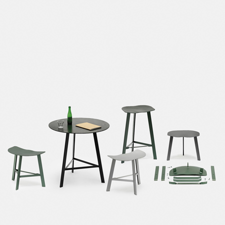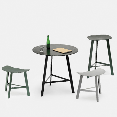 "Hand Forged" と名付けられた軽量のスツール&テーブルシリーズは、サンドブラスト加工と陽極酸化処理(アルマイト処理)が施されている。