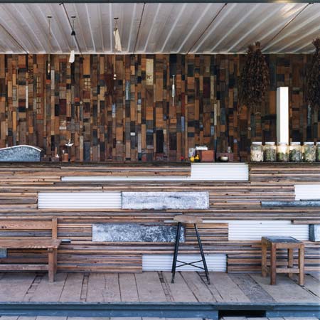 バーカウンターは古材の板を集積させて台状にしました。表面のところどころには、貰い物の、通常は工場で処分されてしまうアルミパネルの端材が同じくモザイクのように組込まれています。
