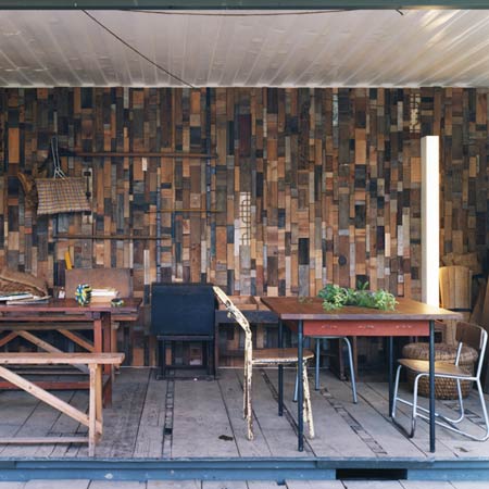 2009年、越後妻有の旅で、ハーブマンコンテナが初めて具現化されました。私たちは越後妻有の空家(古民家)を解体し、古材を手に入れ、それらを加工して内装を制作。モザイク状の壁は、長さと幅を4種類設定し、それら古材を積木のような形状に切断。その積木状の材を、規則に従い、モザイクのように組み合わせ制作されました。その中には、サイズが合った、古い升、そろばん、古材の箱などが組み込まれています。そのことから、EARTHSCAPEの選んだサイズと日本の伝統的なサイズが合致していたことが分かります。