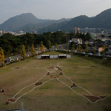 日本有数の温泉地(国際観光文化都市)大分県別府市で開催されたMHCPは、ハーブマンは全長60mに及び、グラフィカルに表現されました。広大な敷地に、ハーブマンマップ(部位で区切られた人型のどこに何が効くか図示されたもの)が巨大に描かれました。このように、ハーブマンの表現方法は旅先の地にあわせ様々に展開されます。各部位に効く薬草がそれぞれ1株ずつ、参考に植えられていて、その横に薬草の効用が書かれたカードがかかっています。それはオーダーカードになっていて、人々は巨大なハーブマンの上を歩きながら、体のどの部分に何の薬草が効くのか理解し、自分が飲みたい薬草のカードを選ぶことができます。選んだカードをバーカウンターに持って行くと、カードと薬草茶代と引き換えに、薬草茶が提供されます。ところどころ、オーダーカードではなく、「草原に探しにいっています。」などハーブマンのメッセージが書かれたメッセージカードがかかっている部分もありました。