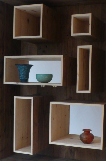 キャビネット'Reveal' はリサイクルの床板を使用しているにもかかわらず、材料である厚板の特徴ともいえるラフ感とは対照的なシンプルな外観に仕上がっております。収納やディスプレーとして使用できる切り抜き部分があります。前面の扉を開けると、様々なサイズと形状のボックスが姿を現します。ボックスやボックス間の空間は、収納スペースとして利用可能です。