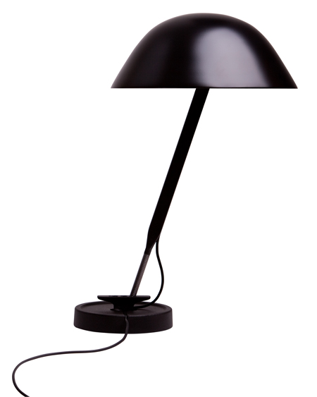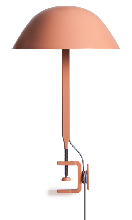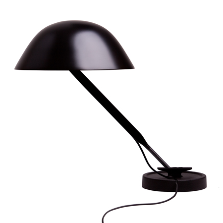 この単純な形のランプは、釘や画ビョウのように単純かつ頑丈であることを意図して、作られたものです。従来型の工作機械照明同様に、伝統的な工業的要素を改善しつつ、頑丈で長持ちする構造となっており、止め具部分は使い勝手を考えて反転されています。このランプは、頑丈さと軽さがミックしています。薄いはりがランプの2対の対抗部分をつなげ、どっしりとした鋳造製の台が繊細な傘を支えています。このシルエットと様々なポジションが、まるで小さな傘を思わせます。