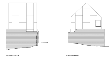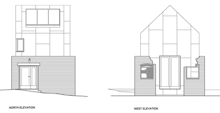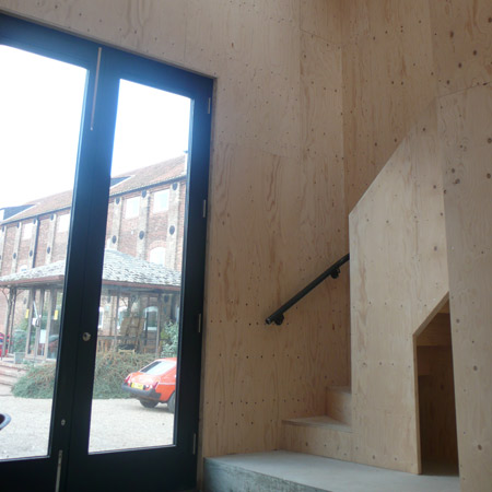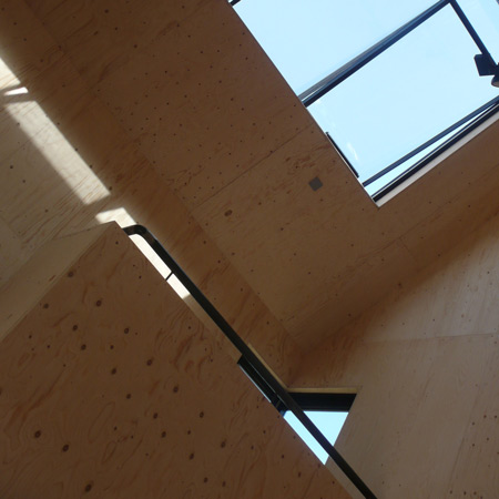 コーテンスティール製の構造体が挿入される前に、新旧構造体の間を雨水がよく流れ落ちるように基礎レベルで新しい排水溝が勾配をもって成形され、ドアの敷居のあたりで溝に流れ込むようにしました。内部空間の壁と天井は断熱が施してあり、高性能湿気調整層でシーリングがしてあります。コーテン製の殻の中に材木の「箱」をつくるために小ぎれいなベニヤで裏打ちされています。積層状のベニヤシートはまた階段、手すり面、そして中二階にも貼られています。