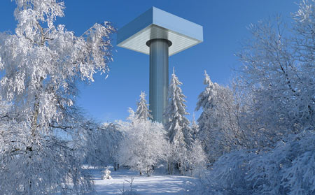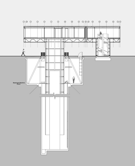 ヴィラの支柱と可動部分は、枠台に吊り下げられ押さえとして機能する260トンのスチール・プレートによって均衡を保ち、中央内部のスチール・チューブ構造内で導かれ、エネルギー効率の良いセダン車に匹敵する22キロワットの駆動モーター8基によって可動します。