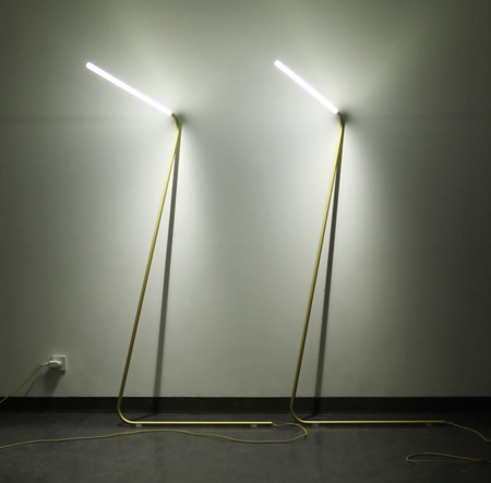 折り曲げられたアルミニウム製チューブは陽極酸化することで金色となり、冷たい輝きの光の中に温かさを放ちます。90個のLEDライトの先端はアクリル材に内包され、光は凝縮され増強されます。アクリルはつや消しされているので不透明で、光もまぶしすぎるということがありません。