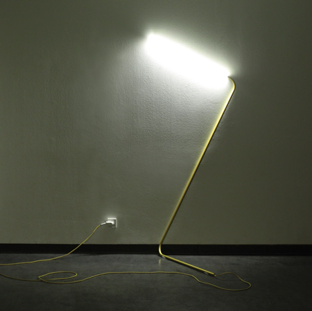 相対性の普遍性ー空間と照明は対になっています。このランプは、壁や床の面に擦り寄ったり離れたりと、角度を変えながら平面と戯れます。立体感のあるZ形ランプは、壁に立てかけられるようしっかりと作られています。ランプは3点で支えるか、もしくは壁から床まで平行から90度までと角度を変えながら、支えられます。