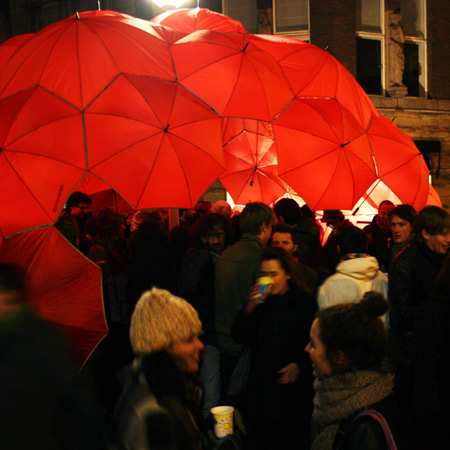 先頃、アムステルダムのデザインスタジオDUS ArchitectenとStudio for Unsolicited Architectureは、ロッテルダム市内の街灯に傘を組み合わせたドームを作り、そこでパーティーを開いた。