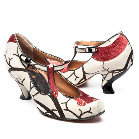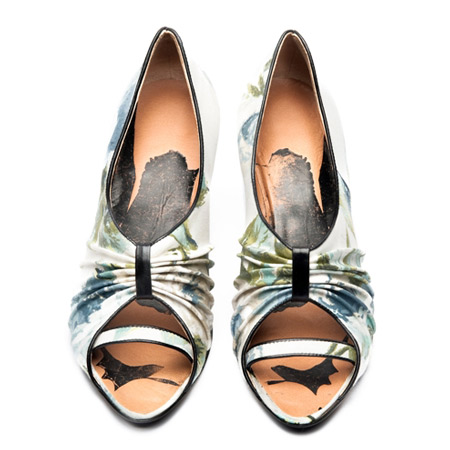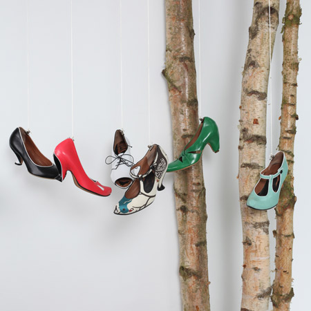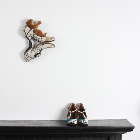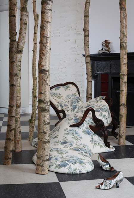 コラボレーションはニナ・サウンダース氏による巨大な造形作品とトレイシーが全力を注いできた靴コレクションによって確固としたものになるでしょう。この2種の作品はサンダーソンのヴィンテージテキスタイルの復刻版を使用しています。家具の溶けた部位やサンダーソンによる布張りなどが個性的に変容したニナの造形作品は、この官能的で遊び心溢れる既成観念の破壊を展開しています。トレイシーの靴はさらにこれを発展させます。成形ラバーソールはサンダーソンのテキスタイルで巧みに挿入され、つまり靴は完全なるパターンを身につけているのです。それは靴業界において草分け的なアプローチであり、さらに妥協の無さがカットと印象に残っていて絶妙です!