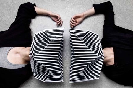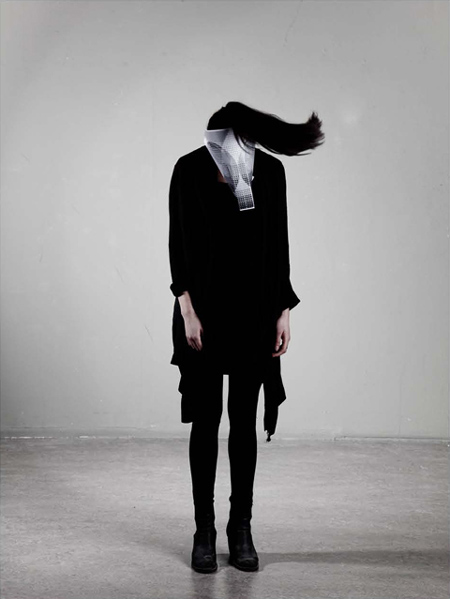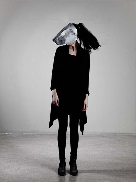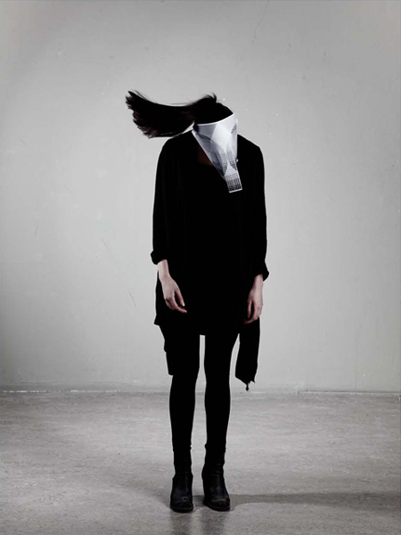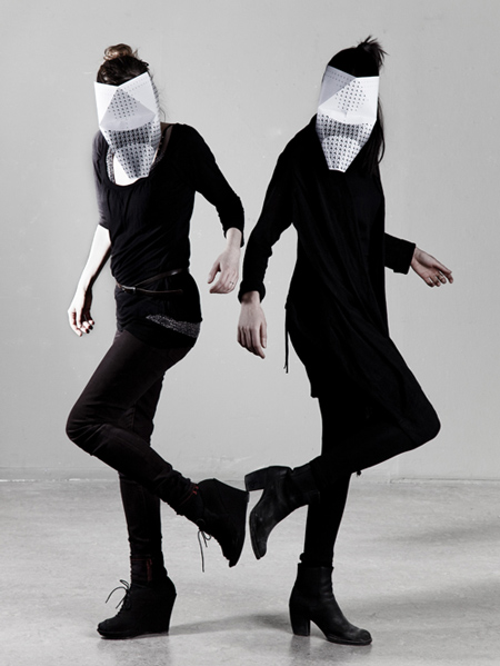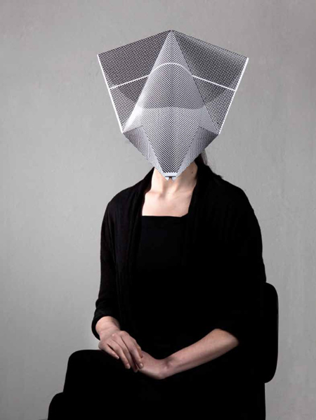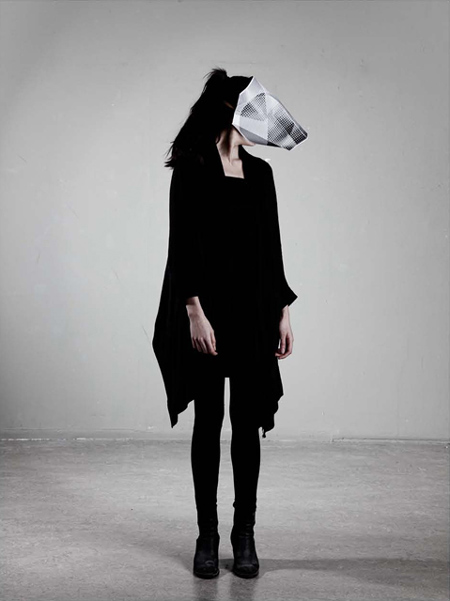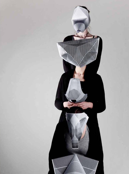 アムステルダムのデザイナー、マイケル・ショナー氏がデザインした紙製の仮面一式は、目の部分に穴が開いていないので、まるで動物の顔のように見える。