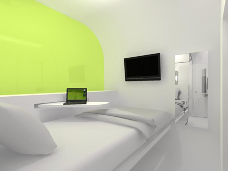シングルタイプのBubbleには、寝室、浴室、インターネット接続端子の付いた折りたたみ式の作業スペース、搭乗時刻を知らせるモニター、さらに音響設備が取り付けられている。