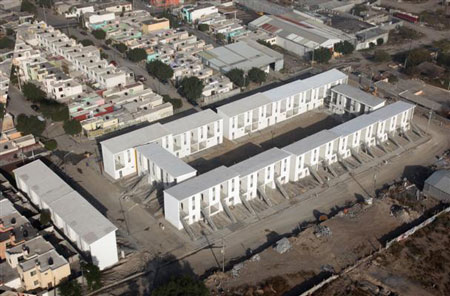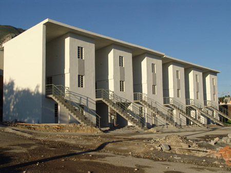 メキシコ、ヌエボ・レオン州より我々に、サンタ・カタリーナの6ヘクタールの敷地に中流家庭を対象にした70戸から成る団地を建設する依頼がありました。要求されている戸数から、我々がイキケ(チリ北部の町)で住宅を建築した際の技法が応用できることが分かりました。しかし、年間降雨量が600mmに達するサンタ・カタリーナの気候は、乾燥したチリ北部の気候とかなり異なるため、新たな課題に取り組む必要性があったのです。