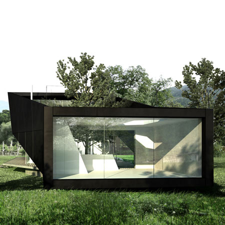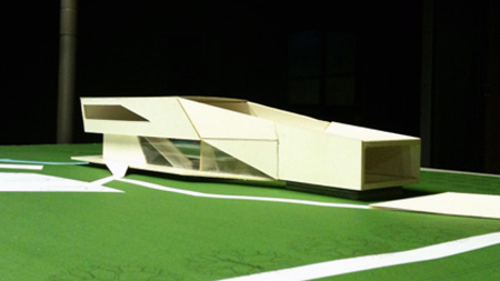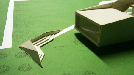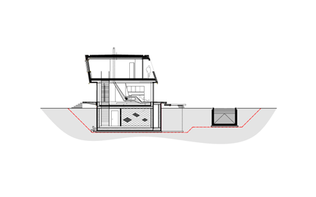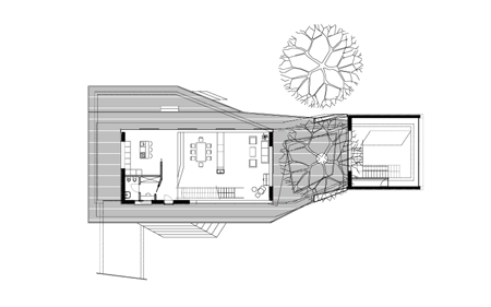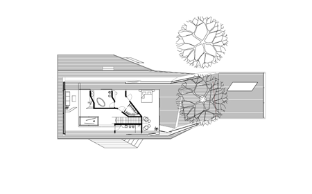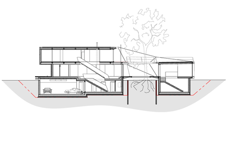 このプロジェクトの中核を成す構想は、二本の木を保存し、その内の一本を建物の構造の中に組み込むことでした。そのようにして組み込まれた空間は、「緑の中庭」となって建物を2つに分離します。依頼主の要望により、一方が住居に、もう一方が写真スタジオになります。住居の部分は上下二階に分かれ、上下の棟を僅かにずらして設計することによって、下の北側は玄関の天蓋に、上の南側はテラスになります。