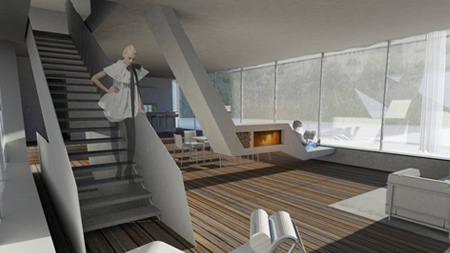 下の居住スペースはオープン設計の間取りにして、プールを望む南向きのテラスに隣接しています。建物全体が高さのある土台によって支えられているため、内側からも素晴らしい景色が堪能できます。