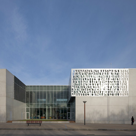Le beau béton, car les parois extérieures sont traitées en panneaux matricés se déclinant en claustras sous forme d'énigmes indéchiffrables devant les parois vitrées extérieures et signe, d'une façon sans ambiguïté, l'identité du nouvel équipement.