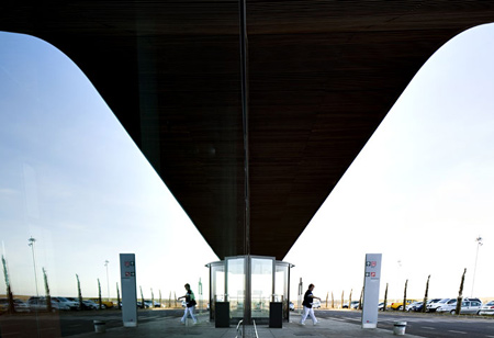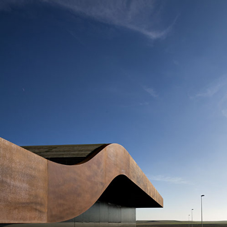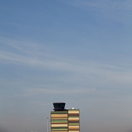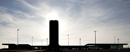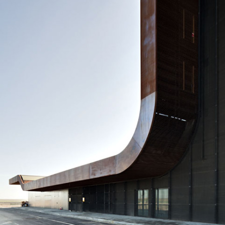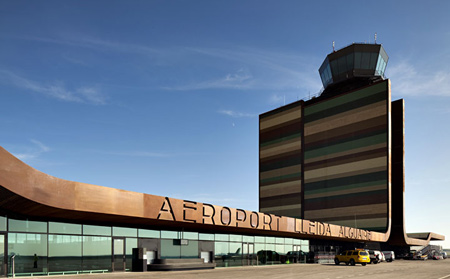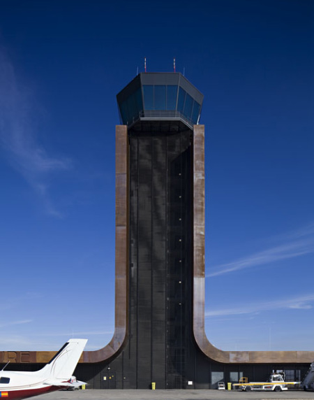 リェイダ・アルガイア空港の敷地内にあるこの建物は高さ41メートルで、コールテン鋼で縁取りされた基部の屋根が、這い上がるように管制塔の両壁となって伸びている。