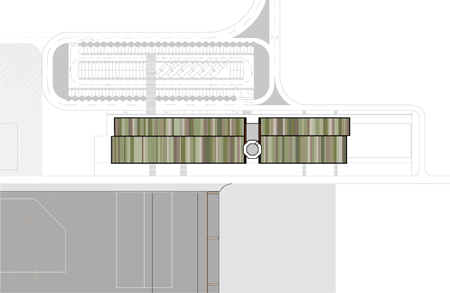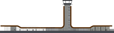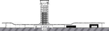 両側の外壁は、建物の見える部分(基部の屋根と塔の両壁)をほとんど包み込む広い毛布の役目を果たし、これによって建物全体に統一感が生まれ、将来、空港敷地内にある他の施設と一体になります。