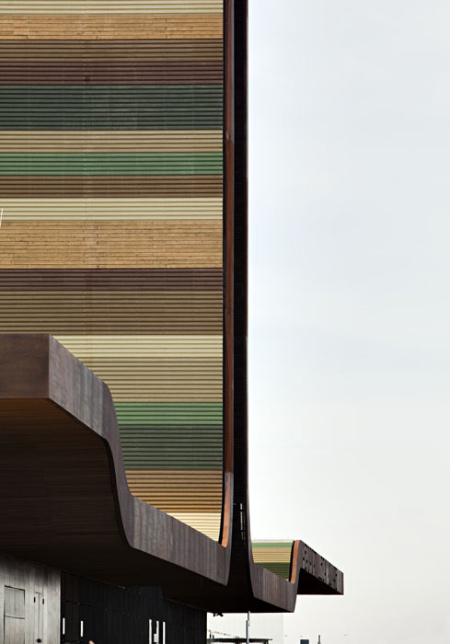 緑、茶、黄色の金属板で覆われた外壁全体も、建物に視覚的な統一感を与える要素の一つであり、これにより周囲の景観との調和が図られます。水平に金属板を重ねた外壁には、野菜と木材やベニヤの色を交互に組み合わせます。この外壁は野菜の色を使用することで周辺の畑と調和し、同時に熱障壁の役目も果たします。