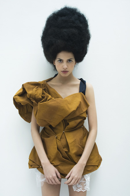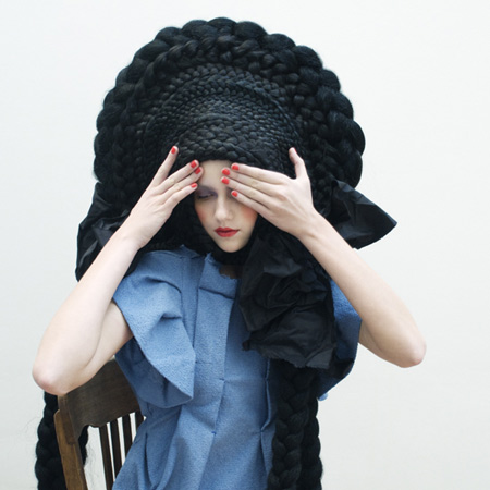 この撮影のためにスタジオ・マリソルは、編みこみのショールとバズビーのようなスタイルのボンネットを製作した。