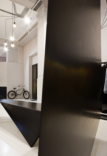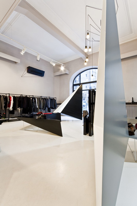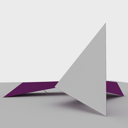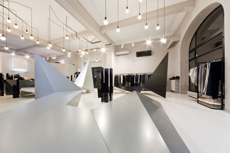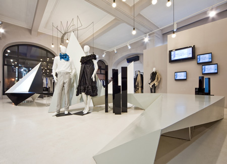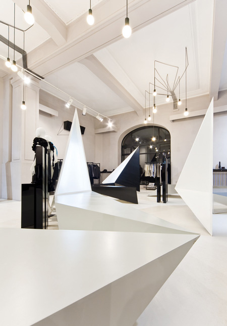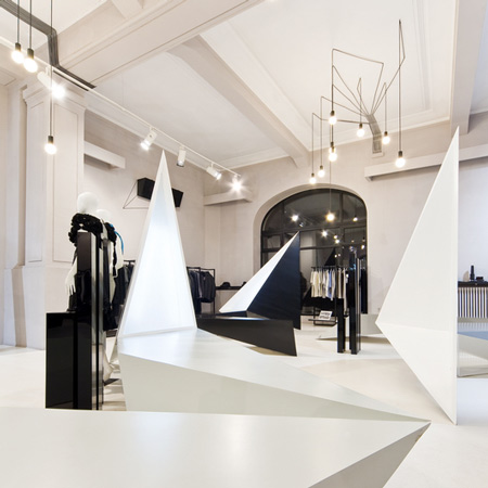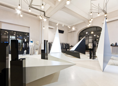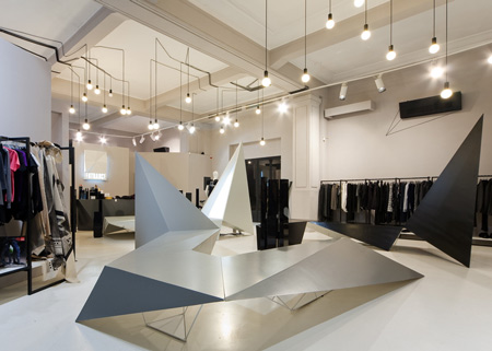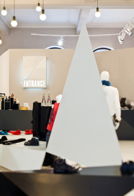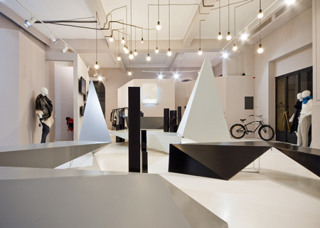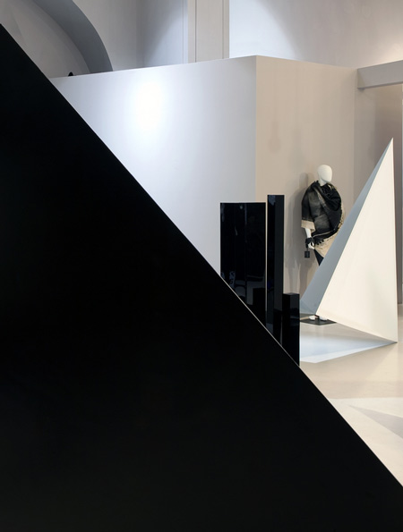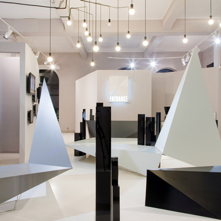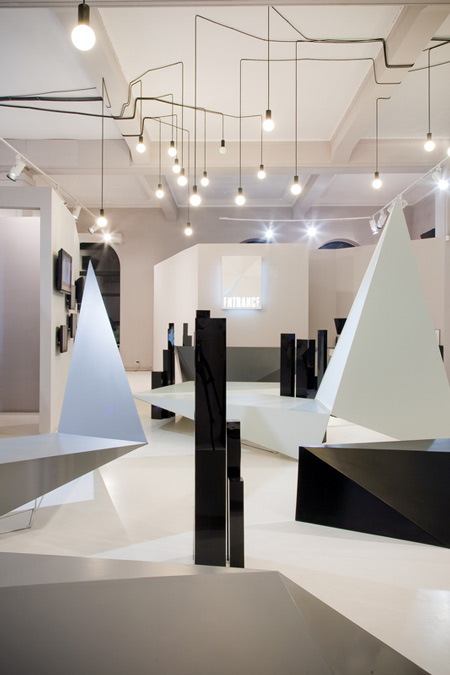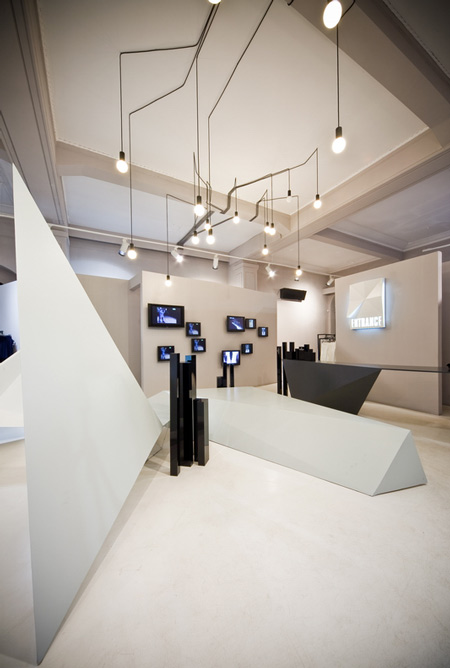 角張ったディスプレイスタンドから天井に向かって三角形のボリュームが延びている。
