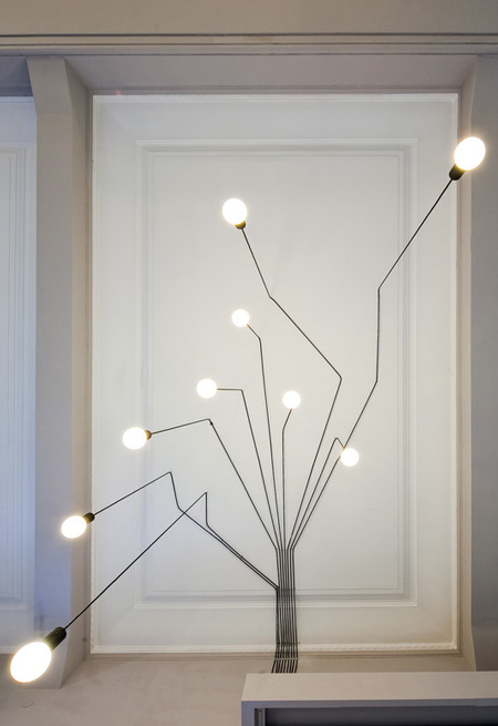 「Entrance」と呼ばれるこのプロジェクトは、モノトーンなインテリアが特徴的で天井から扇のように広がって角張った線を作り出す電気コードの先端に電球がぶら下がっている。
