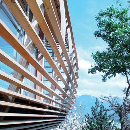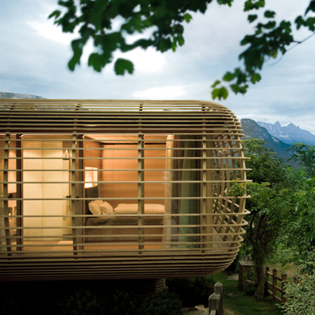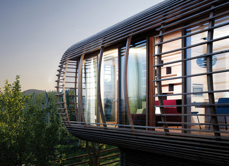 必要最小限に抑えたデザインは、建材の特色を重視し自然との調和を求めたものになっています。日よけを兼ねた窓の外側の格子によって、三重のガラス窓で覆われた空間はユニークなキノコ状の独立した建築になっています。