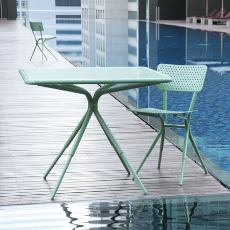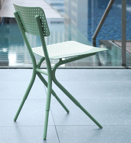 テーブルと椅子の脚は下に向かって細くなり、多数の丸い小さな穴が開いた表面のデザインによって、水はけがよくなる。