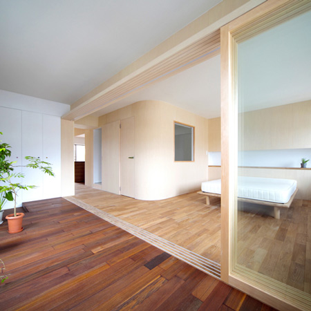 「翠ヶ丘の住宅」と呼ばれる室内は、オープン設計の居間や寝室を被覆する、カーブを描いた木造の壁に特徴がある。
