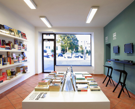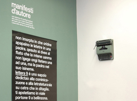 Ondemediaが、図書館とネットカフェの中間となるような新しい空間を作りたいと私に相談してきました。書物とインターネットについて伝達という側面を分析し、両者の共通項は文章であると気づいたのです。書籍の文章、あるいはハイパーテクストの文章は、その形ではなくその関係性に革新性があります。私は文章と文字の世界をつなげ、タイプライター愛好家、そして収集家となることで、マルチェロ・ニッゾーリのオリベッティ「lettera22」に敬意を表せさずにいられなくなりました。このカルト的なオブジェにより私は、建物の番号を使って「lettera9」として再洗礼することを思いついたのです。建物の中は、一方の壁がデジタルに、もう一方がアナログ専用です。革新性はその関係性にあるのです。