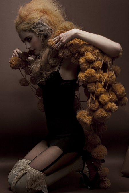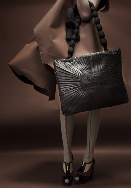 ロイヤル・エクストリームと名づけられたこのコレクションでは、シルクのへり、ウールのポンポン、羊の革のバッグ、フロントにプリーツのついたストッキングなどが多用されている。