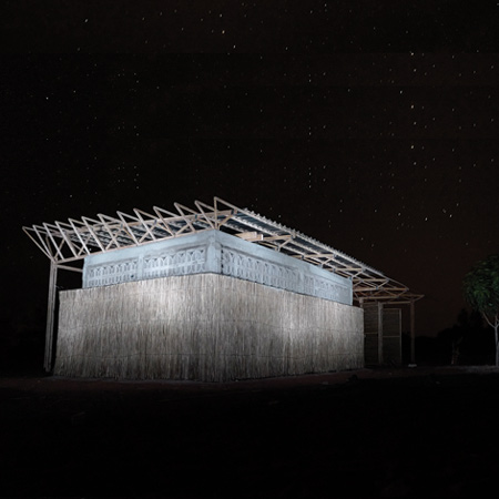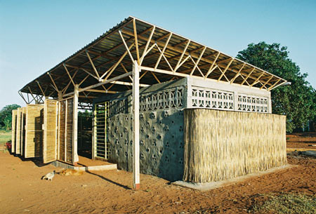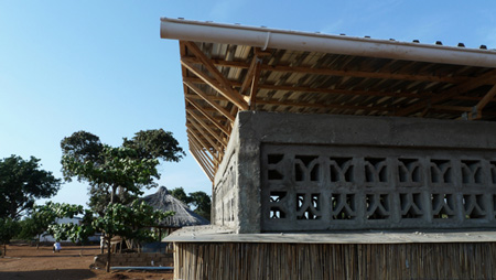 屋根は雨水を貯水槽に集めます。波型の鉄板で出来ていて、低コストの手製の藁の束の上に載っています。わらの束は室内を冷やすための自然の通気孔を作り出し、地元で安く調達した藁のマットで作った室内屋根が、熱風を外に出してくれます。