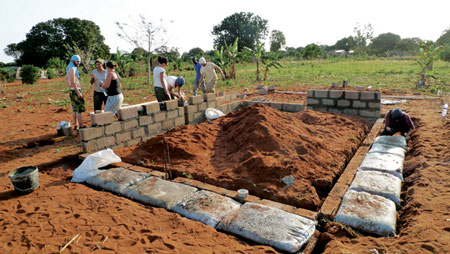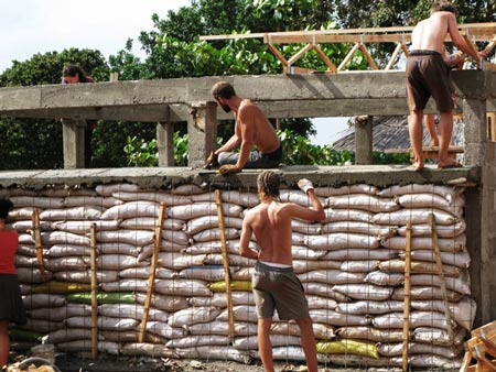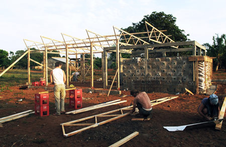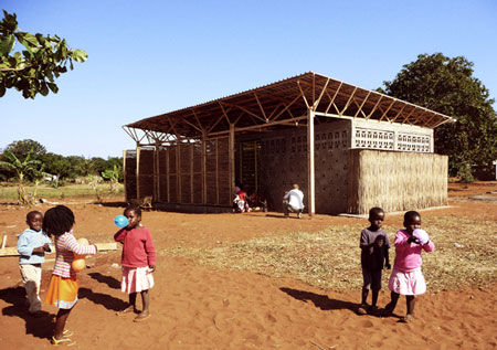 ノルウェーの ベルゲン建築学校の学生たちが、モザンビークの村で砂袋、瓶、草を使った校舎を建てた。