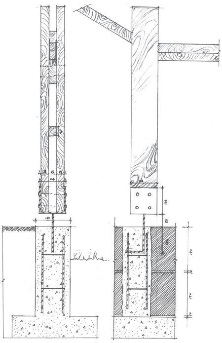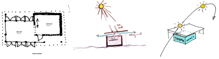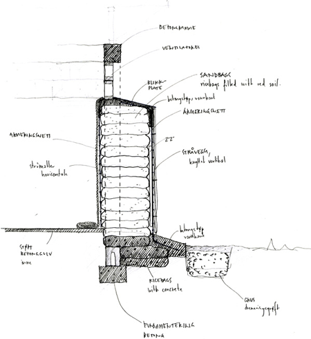 補強されたコンクリートの骨組みが、閉じた部屋に永久的構造を作り出しています。この骨組みによって、詰め物としてはより安価で暫定的な素材を使うことができます。屋根の延長部分が夏には太陽光を遮り、東側と北側のファサードには、冬は温熱材としての機能を持つ砂袋を実験的に使ってみました。