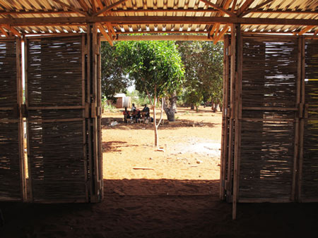 オープンな部屋は軽い藁の扉がついており、空間をフレキシブルに使うことができます。南は校庭に向かって、北は小さなマンゴの木に向かって、部屋を完全に開けることができます。