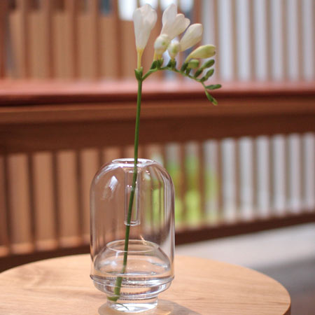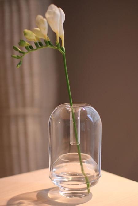 パリのデザインスタジオA+A coorenが考案したガラス製の花瓶は、差し込み口が花瓶の内側に向かって細く伸び、茎を支えるような作りになっている。