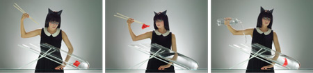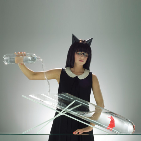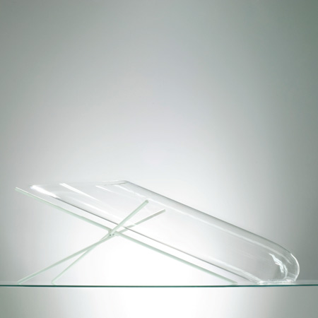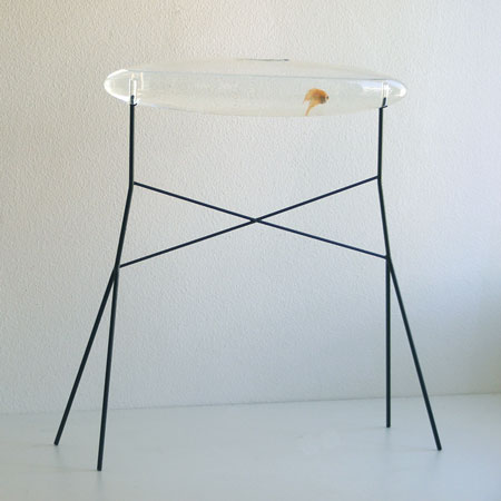 この水槽は曲線部分を併せ持つガラス製で、金属製のパーツが水槽の傾斜ラインの中央をはさむ構造となっています。エアーシリーズの他の作品同様、「エアー3」も実験用ガラス器具の特性を生かして制作されました。スタンドに支えられながら空中で傾斜を保つ「エアー3」は、「重力」と「高度」をテーマに掲げています。