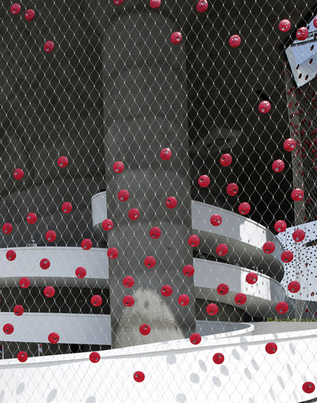 パビリオンを包む相互作用的でかつ高機能なファサードは、建物1階の都市的エリアへアクセルするために来場者がくぐり抜けるアルミ製の金網のカーテンでできています。エネルギー源、貯蓄ユニット及び消費ユニットからなる発光ダイオードの照明はこのファサードに組み込まれています。太陽光や来場者のカメラのフラッシュなどパビリオンの周辺環境によって引き起こされるフラッシュという形で発生したエネルギーは視覚可能になります。それぞれの個々の貯蓄電池がお互いに接触することで、ファサードは夜間も作動(点灯)しています。
