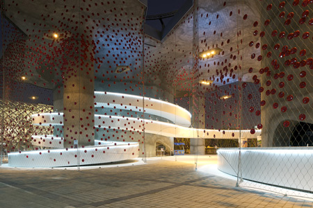 このパビリオンはアルミニウム製金網のカーテンが太陽エネルギーを蓄え、このエネルギーが夜になると外観のライトアップに利用されるのが特徴的。