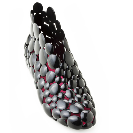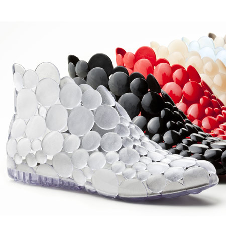 メリッサがガエタノ・ペッシェ氏と提携してデザインした靴は、稀に見る画期的な製品です。この足首までの短いブーツは、プラスチック製の円板だけを組み合わせて作られ、縁の円板を取り外すことで、一足の靴が履く人の好みに合わせて7通りのブーツに変身します。組み合わせ方を変えることで複雑なデザインが生まれる折り紙をイメージして下さい。この靴には、黒、赤、灰色、透明色、水色、淡いオレンジジの6色が用意されています。