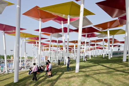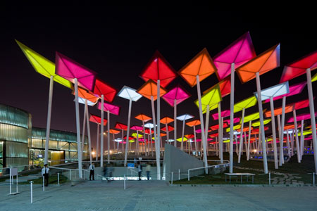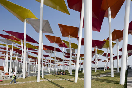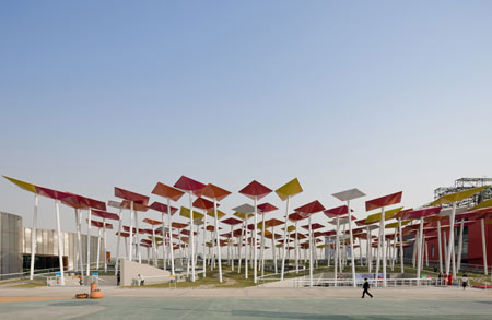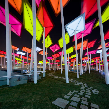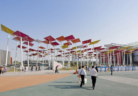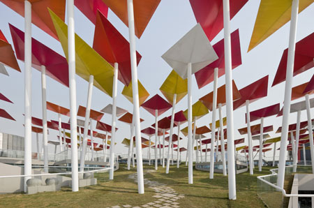 このパビリオンは凧のような形をしたエレメントが傾いた白いポールの上にのっかり、傾斜した敷地に整然と並んで来場者を大広場に導くように計画されているのが特徴である。