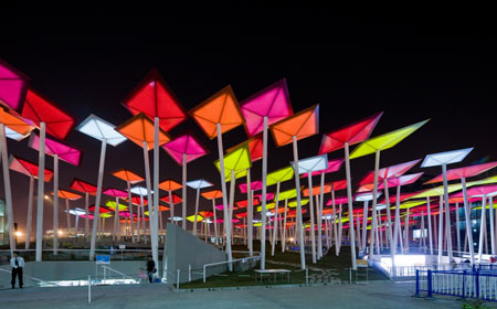 「凧の森」の130個のプラスチック製「凧」は5色の鮮やかな色に塗られ、夜になるとライトアップされて明るい灯籠のように見える。