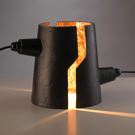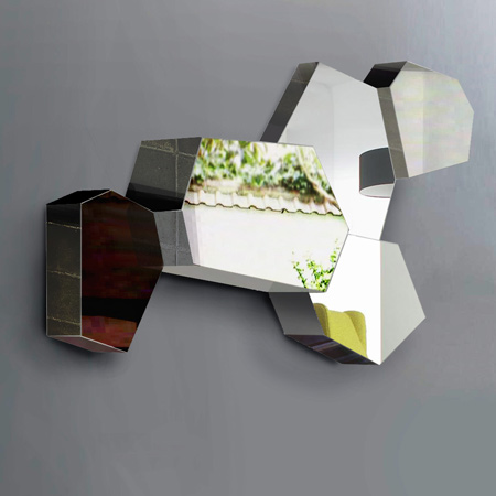 「薄切りの丸太の鏡」は擬態としての「薄切りの丸太」からなります。この作品は自然界の切り出した丸太の無骨なイメージと洗練された鏡磨きの表面を組み合わせ、実際は外の世界を内部に持ち込み、同時に反射角度によって全ての表面を改めて作り出しているのです。また逆に、レヴィ氏は自身の作品である鏡磨きのステンレススチール製の彫刻を個人の庭園などの屋外に設置して、周囲の植栽を映し出しています。自然環境にこのような思わぬオブジェを設置することで周囲にそしてその空間に新しい意味を与えます。それゆえデザイナーの定義する生活への概念として「生活とは、極めて何もそれらしくはないところのサインとシンボルのシステムである。」ことを反映しています。岩石シリーズの作品は周囲を映し出しますが、設置された空間と光の断片的な反射像を作りつつ、葉でさえも分離してしまうでしょう。ユニークなプロトタイプである「岩石の棚」と「薄切り丸太の鏡」の紹介の次にPriveekollektieはまた銅製の「ミクロな岩石の彫刻」と「フラクタル L.E.D.」という光のオブジェをバーゼルにて紹介します。