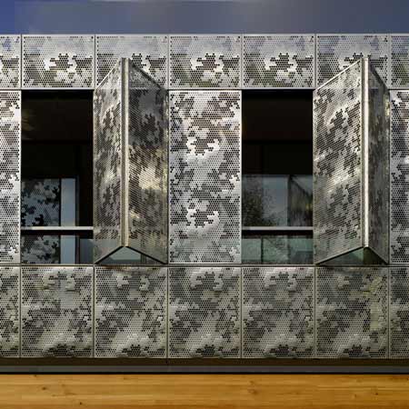 これらの影響をヒントにして生まれた模様が、日光を遮ると同時に防犯面でも威力を発揮する36mmのウォータージェット切断加工を施したアルミ製パネルにデザインされています。